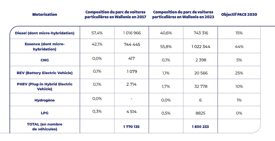 Le parc de véhicules particuliers en Wallonie connaît une transformation profonde, bien que progressive. Si le nombre total de voitures a légèrement augmenté entre 2017 et 2023, passant de 1,77 à 1,83 million, c’est surtout la composition de ce parc qui évolue.