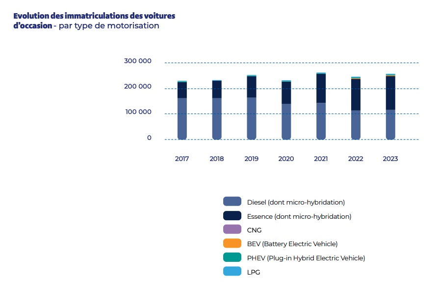 On observe un effondrement des immatriculations de voitures diesel neuves, tandis que les motorisations BEV et PHEV représentaient 18,5% des ventes de voitures neuves en 2023. Le marché de l’occasion, quant à lui, reste dominé par les motorisations thermiques traditionnelles, ce qui ralentit le verdissement global du parc.
